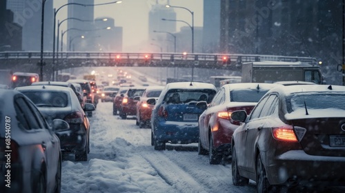 Frozen Standstill: City commute nightmare as cars are trapped in a snowstorm-induced traffic jam on a cold winter day. Icy roads create a picturesque yet challenging scene