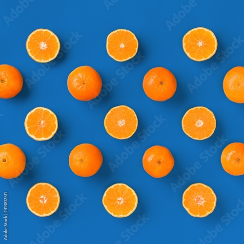 Fruit pattern of fresh orange tangerine or mandarin over blue background. Flat lay, top view. Pop art design, creative summer concept. Citrus in minimal style..