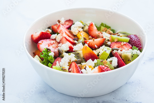 fruit, salad, berry, strawberry, kiwi, feta, cheese, seed, nut, vegan, peach, fiber, vegetarian, detox, yellow, leaf, slim, slice, tasty, vegetarian, freshness, assorted, various, mix, ripe, bowl, tropical, dessert, juicy, sweet, red, diet, vitamin, nourishment, breakfast, summer, food, healthy, fresh
