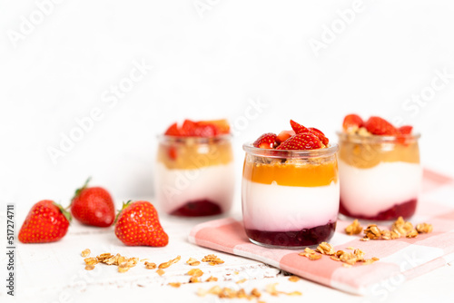 Fruit yogurt berry with muesli and fresh strawberries, on a white wooden background