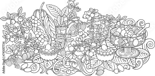 bakery, berry, blackberry, blueberry, tree branch, card, cartoon, cherry, composition, creative, decorative, dessert, diet, flower, food, forest, fresh, fruit, fruit, funny, garden, gardening, grass, green, harvest, health, illustration, ingredient, isolated, leaf, lifestyle, line art, natural, nature, object, organic, raspberry, season, seasonal, vignetting, spring, strawberry, summer, sweet, vinery, vitamin