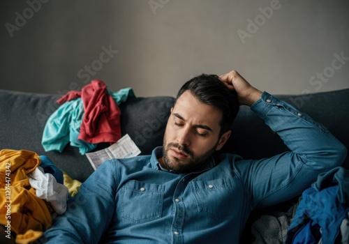 man, laundry, clutter, home, frustration, relaxation, clothes, stress, domestic life, disarray, sleepy, sofa, responsibility, casual clothes, sitting, lifestyle, modern, indoor, emotion, pause, tiredness, multitask, textile, chaos, overwhelmed, male, untidy, colours, playful, waiting, casual attire, soft light, thinking, pensive, chore, management, leisure, comfort, disorganization, fashion, routine, background, daydreaming, solitude