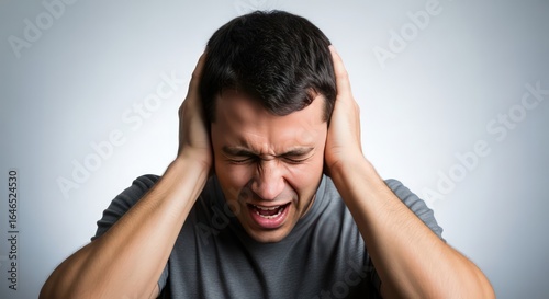 man, frustrated, screaming, anger, stressed, anxiety, stress, noise, loud, cephalalgia, depression, mental health, emotional, unhappy, upset, pain, pressure, annoyance, discomfort, annoyed, mad, shouting, irritated, scream, yelling, despair, crisis, problem, difficulty, burden, fear, tension, studio shot, studio, hand, head, face, eyes closed, mouth open, indoor, dark hair, caucasian, adult