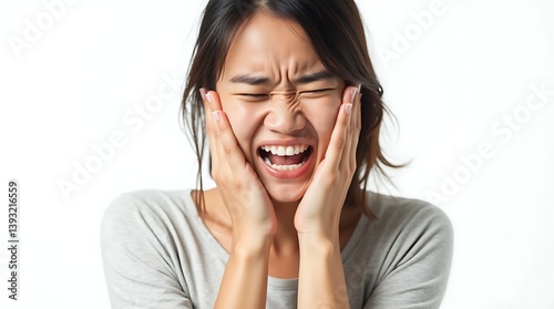 Frustrated Young Asian Woman Gritting Teeth on White Background
