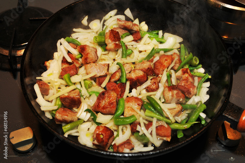 green, fried, pork meat, meat, meal, fries, dish, dinner, white, brown, food, many, piece, eat, delicious, tasty, rich, protein, substantial, nourishing, long, mixed, healthy, bean, cooker, frying pan, black, steam, hot, vegetable, cast iron, cooking, cook, home