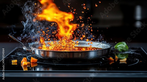 Frying pan flare-up culinary action in modern kitchen food photography high-contrast view dynamic scene