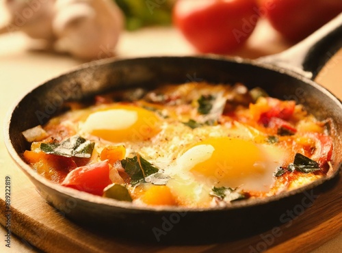 Frying pan with tasty vegetable shakshouka on light background, closeup. Tunisian Traditional Food. Dish from Tunisia.