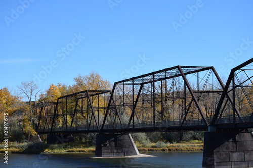 bridge, river, water, sky, architecture, travel, landscape, blue, transportation, road, structure, steel, construction, landmark, metal, autumn, montana, old, wild west, 1888, historic, place, truss, iron, old bridge, clear sky, blue skies