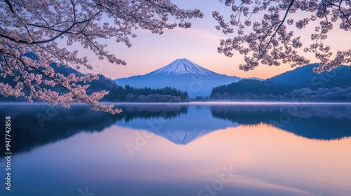 Fuji Mountain reflected in Lake Kawaguchiko at dawn, with vibrant pink sakura branches framing the scene. A serene springtime landscape in Japan.