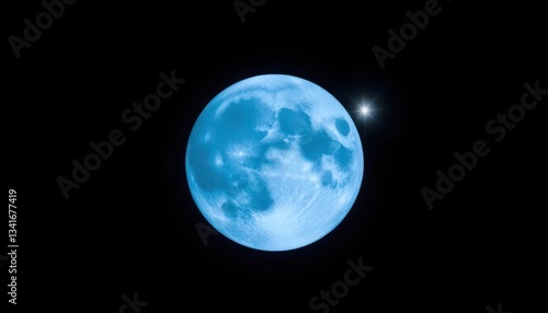 Full blue moon dominates a dark night sky, single bright star nearby, night sky, majestic