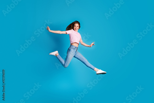 Full body photo of attractive young woman running hurry black friday dressed stylish striped pink clothes isolated on blue color background