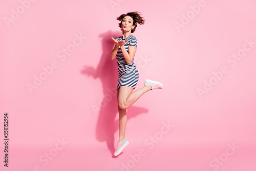 Full body profile photo of attractive lady jumping high up rejoicing sending air kisses boyfriend wear casual white blue summer dress shoes isolated pastel pink color background