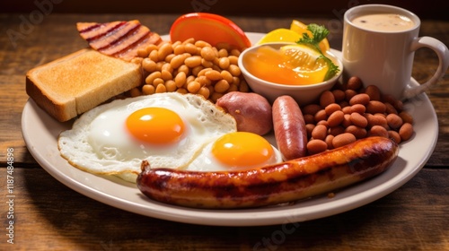 Full English Breakfast with Bacon, Sausage, Eggs and Beans - Delicious Traditional Food for a Hearty Start to the Day