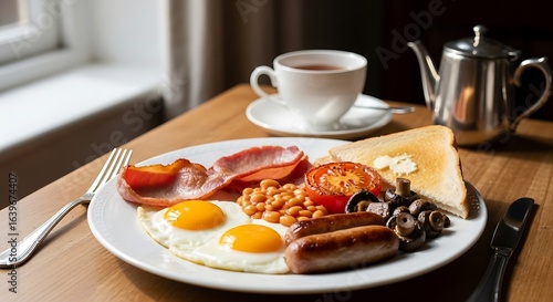 breakfast, fried egg, bacon, sausage, baked beans, toast, butter, mushroom, tea, teacup, saucer, teapot, fork, knife, white plate, wooden table, morning meal, food photography, closeup