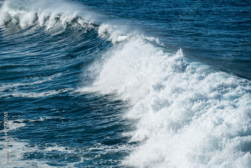Full frame shot of the deep blue Atlantic Ocean and a beautiful wave crashing on the coast of Paul do Mar, a popular surf spot on Madeira island, Portugal