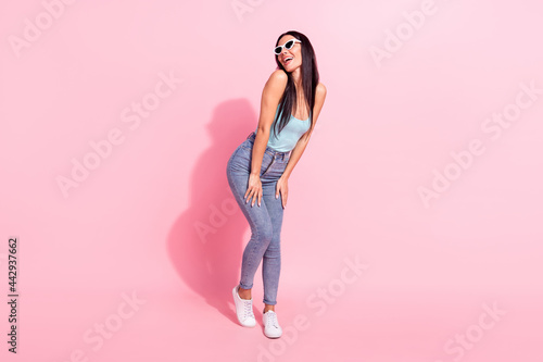 Full length body size photo woman in sunglass laughing overjoyed in summer isolated pastel pink color background