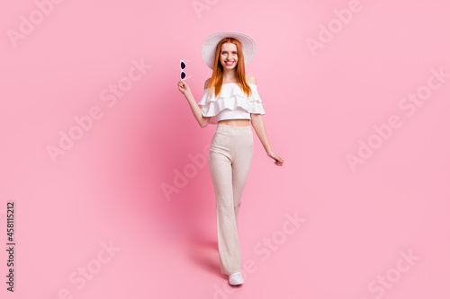 Full length body size view of attractive thin fashionable cheerful girl walking isolated over pink pastel color background