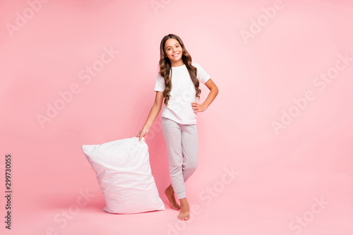 Full length body size view of her she nice attractive cute sweet lovely cheerful wavy-haired pre-teen girl carrying holding in hands white soft pillow isolated on pink pastel color background