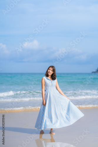 Full length of happy woman in beautiful blue summer dress posing and enjoying a walk on the sea beach with blue sky horizon, vacation and travel ocean concept. Phuket, Thailand.