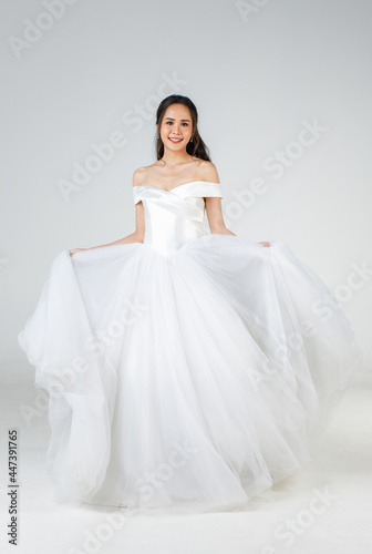 Full length of young attractive Asian woman, soon to be bride, wearing white wedding gown looking happy spinning. Concept for pre wedding photography