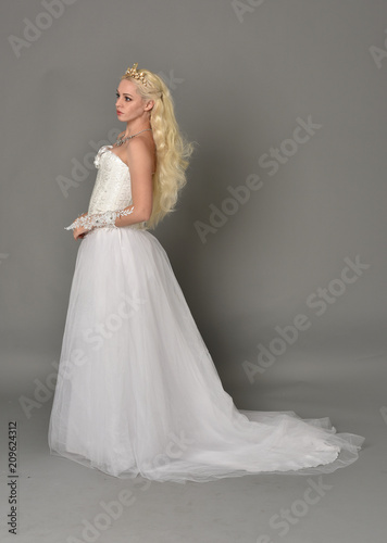bride, bridal, wedding, gown, dress, angel, angelic, princess, queen, royalty, regal, fairy tale, magical, sideway, half face, female, girl, lady, woman, person, figure, young, teenage, full-length, standing, walking, pose, posing, isolated, cut-out, copy space, studio, background, blond, long hair, glove, crown, costume, character, corset, white, pale, slim, beauty, attractive, model, grey background