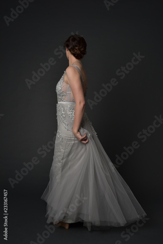 full length portrait of brunette girl wearing beautiful long gown, standing pose with background to the camera on grey studio background.