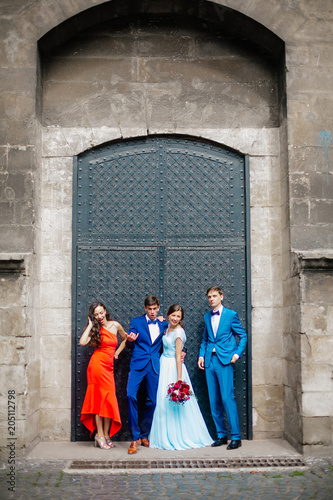 Full length portrait of newlywed couple dancing and having fun with bridesmaids and groomsmen in the old city center. Bride and groom with friends posing near old door and wall