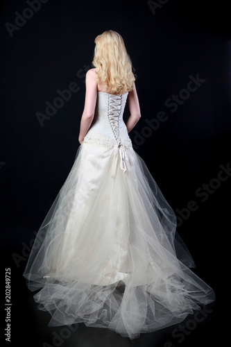 bride, bridal, white dress, angel, angelic, full-length, standing, model, pose, posing, wedding, gown, dress, black background, isolated, blond, veil, girl, female, beautiful, glowing, backview, back, behind, prom, princess, fairy tale, white, background, dark background, beauty, caucasian, fashion, wind, windy, elegant, elegance, modelling, pretty, dreamy, walking, walk, dancing, flowing, long