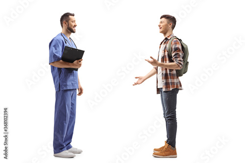 doctor, 2, adult, background, blue, caucasian, clinic, clipboard, conversation, explaining, full, gesticulate, guy, hand, health, health care, holding, hospital, isolated, job, length, listening, male, man, medic, nurse, occupation, patient, person, physician, professional, profile, shot, smile, smiling, standing, student, studio, talking, uniform, virus, white, work, working, young