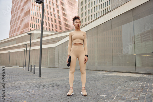 Full length shot of athletic female model dressed in sportswear holds bottle with water for refreshing focused into distance thoughtfully poses outdoors against city buildings. Morning training