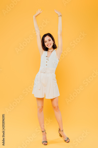 full length view of smiling elegant girl with hands in air isolated on yellow