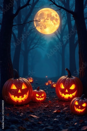 full moon and glowing jack o lanterns in a forest, glow, forest, pumpkins