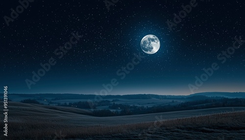 night, sky, star, moon, full, moonlit, field, landscape, frost, glacé, grass, tree, horizon, dark, blue, cold, winter, nature, scenery, rural, quiet, peaceful, serenity, calm, atmosphere, celestial, astronomy, illuminated, light, glow, distant, rolling, hill, farm, agriculture, farmhouse, light, silhouette