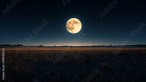 Full moon rising over the horizon in a rural field. Aurora Skylight Horizon. Illustration