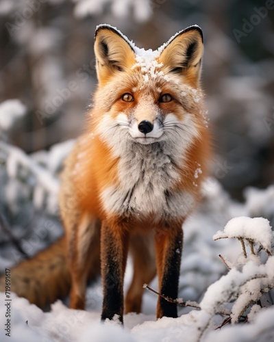 Full-length portrait of red fluffy fox in snowy forest landscape, standing and looking at the camera