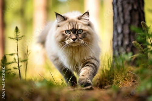 Full-length portrait photography of a funny ragdoll cat hunting isolated in forest background