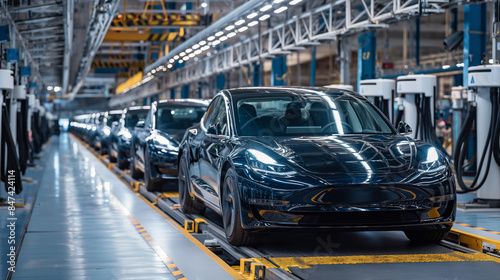 fully assembled modern electric cars at manufacturing facility, EV cars assembly line