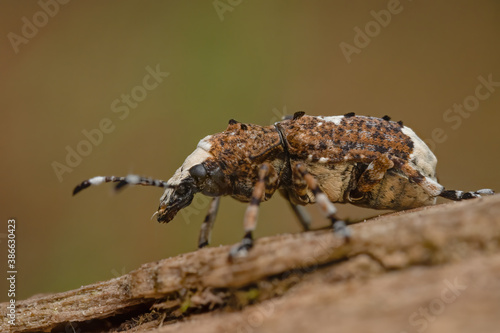 Fungus weevil (Platystomos albinus) sitting on a wooden trunk. Brown and white beetle in its habitat. Insect detailed portrait with soft brown background. Wildlife scene from nature. Czech Republic