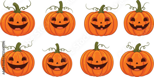 Funny cartoon Halloween pumpkins with smiling faces, cute jack o lantern set, happy spooky pumpkin illustration for holiday decoration clipart