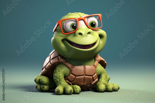 Funny cartoon turtle with glasses on a blue background. 3d rendering