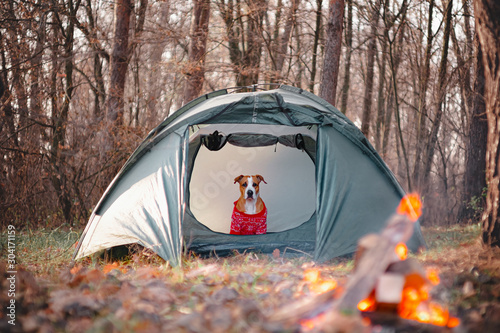 Funny dog in a knit sweater sits in a tent by the campfire. Hiking dog, active pets concept: staffordshire terrier enjoys autumn weather in the forest on a hike.