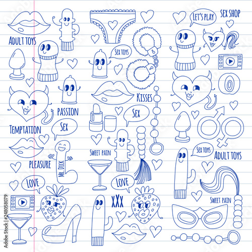Funny icons for sex shop. Cute cartoon characters. Dildo, strawberry, condom, heart. Love and play