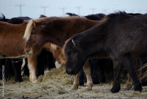 Funny plush Icelandic horses on the farm in the mountains of Iceland eating sear yellow grass
