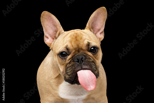 Funny portrait of a French bulldog showing his tongue on isolated black background, front view