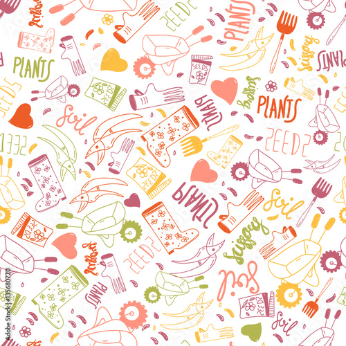 Funny seamless gardening pattern with lettering and equipment. Perfect for wrapping, clothes.