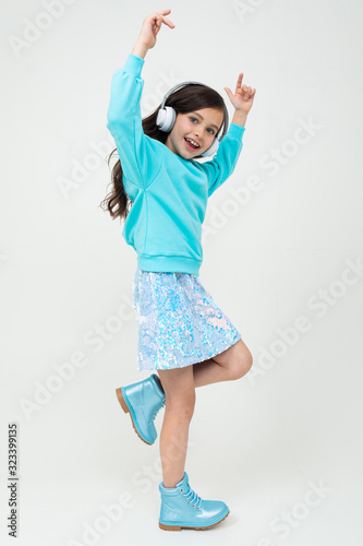 funny stylish young girl dancing to the music on headphones in an isolated studio