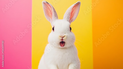 Funny surreal shocked white bunny on colorful background, whimsical and expressive rabbit with exaggerated emotions in vibrant fantasy art