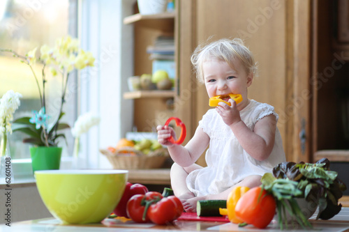 Funny toddler girl eating tasty paprika preparing healthy salad