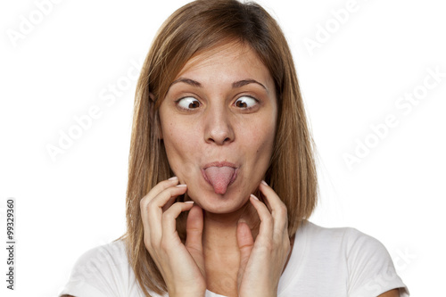 woman, face, emotion, face, fun, beautiful, female, caucasian, attractive, brunette, posing, constructed, up, no, make-up, white, background, beauty, model, studio, girl, tongue, out, young, portrait, sexy, funny, sticking, expression, closeup, people, isolated, 1, humorous, childish, showing, mocking