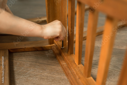 Furniture assembly. The child makes, collects wooden furniture. Furniture assembler with a key. A boy with tools repairs furniture. Son collects furniture at home